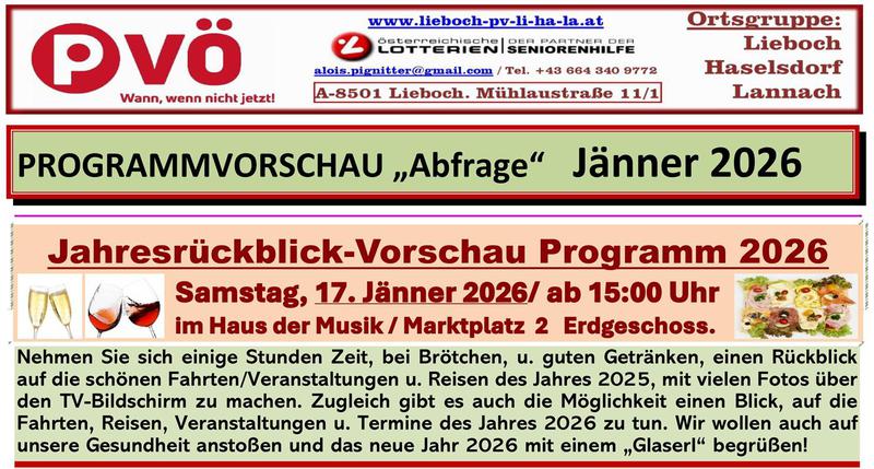 Traditionell zum Jahresbeginn am 17. Jänner fand der Jahresrückblick u. die Programmvorschau im Clubsaal, Haus der Musik statt! Mit selbstgemachten Brötchen unseres PV-Teams u. guten Getränken wurden die Gäste, nach der Vorschau durch unserem PV-Vorsitzenden Bgm. a.D. Alois Pignitter, verwöhnt.